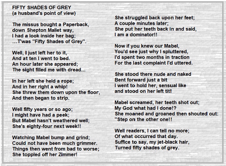 Visions of this 84y.o woman, naked, trying to be sexy with boobs hanging down, hubby trying to be sensual & steps on her left tit & is told to stand on the other one, just after her false teeth fall out for the 2nd time. The joys of old age. If only it would happen to me. I already have the grey hair but for the rest.... I can dream can't l?