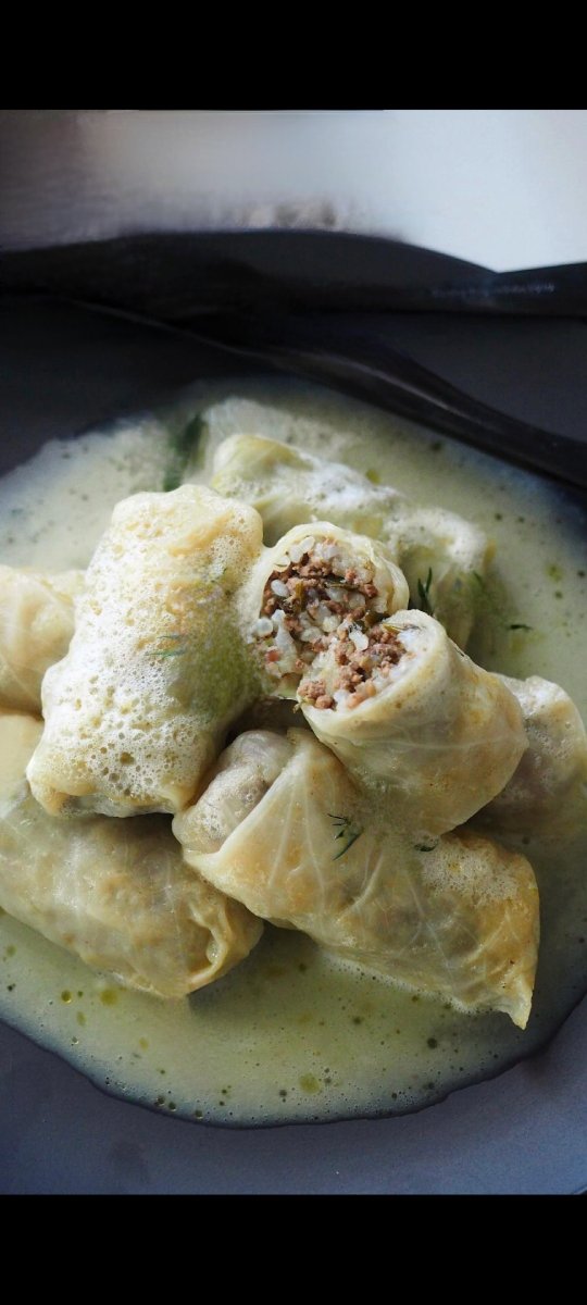 This one is Cabbage leaf rolls filled with beef, rice & plenty of fresh herbs in an egg lemon sauce.