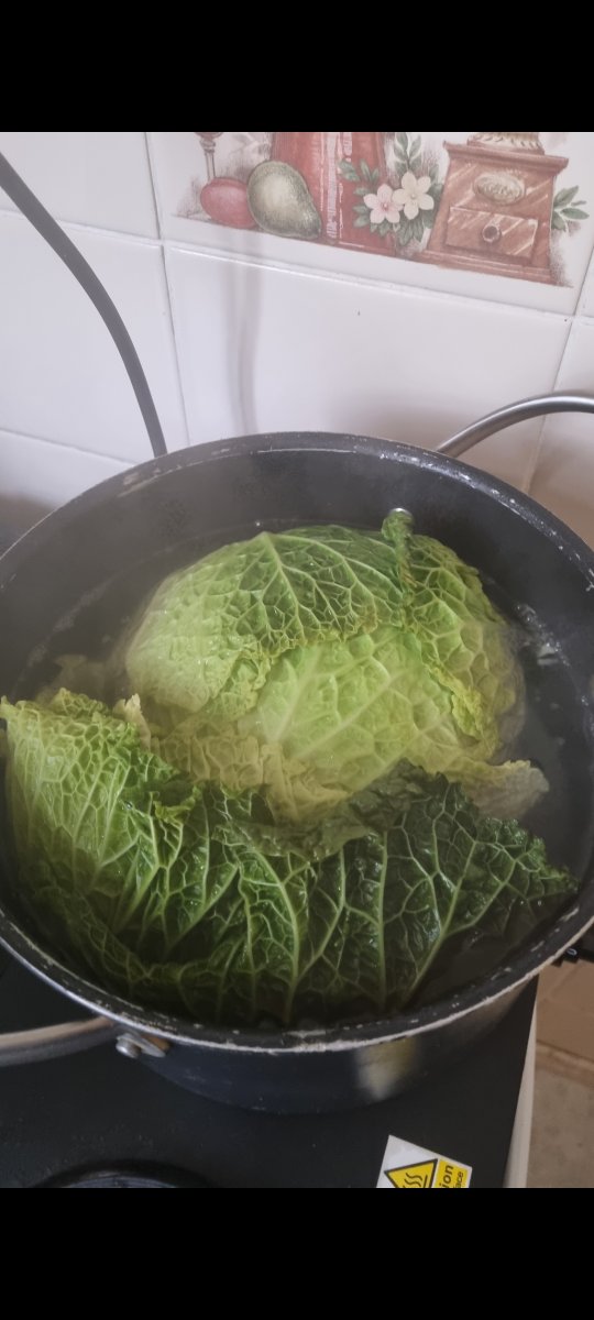 Peel away a few outer leaves of the cabbage if they’re damaged or dirty & discard. Cut out the core of the cabbage, place it in a large pot and fill with water, vinegar & salt. Allow it to boil and gently remove the leaves as they pull away from the body and set aside.