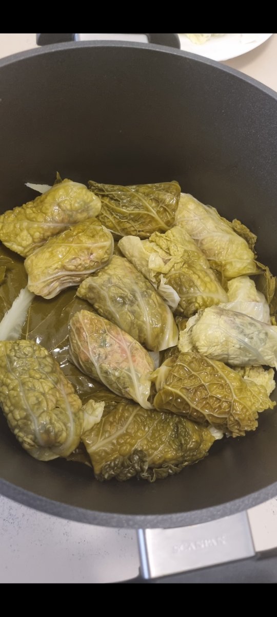 Line your large pot with the leaf cut offs & any odd pieces you cannot use to roll. To fill your prepared leaves, add approximately 1.5 Tbsp of filling toward the bottom of the leaf. Begin to roll up, bring in the sides to seal then continue rolling tightly. Place the Cabbage seam side down tightly in your pot, add stock and water until it just reaches the top layer but not fully covering them. Place a plate on top , bring to boil & simmer on medium heat for approximately 2 hours .