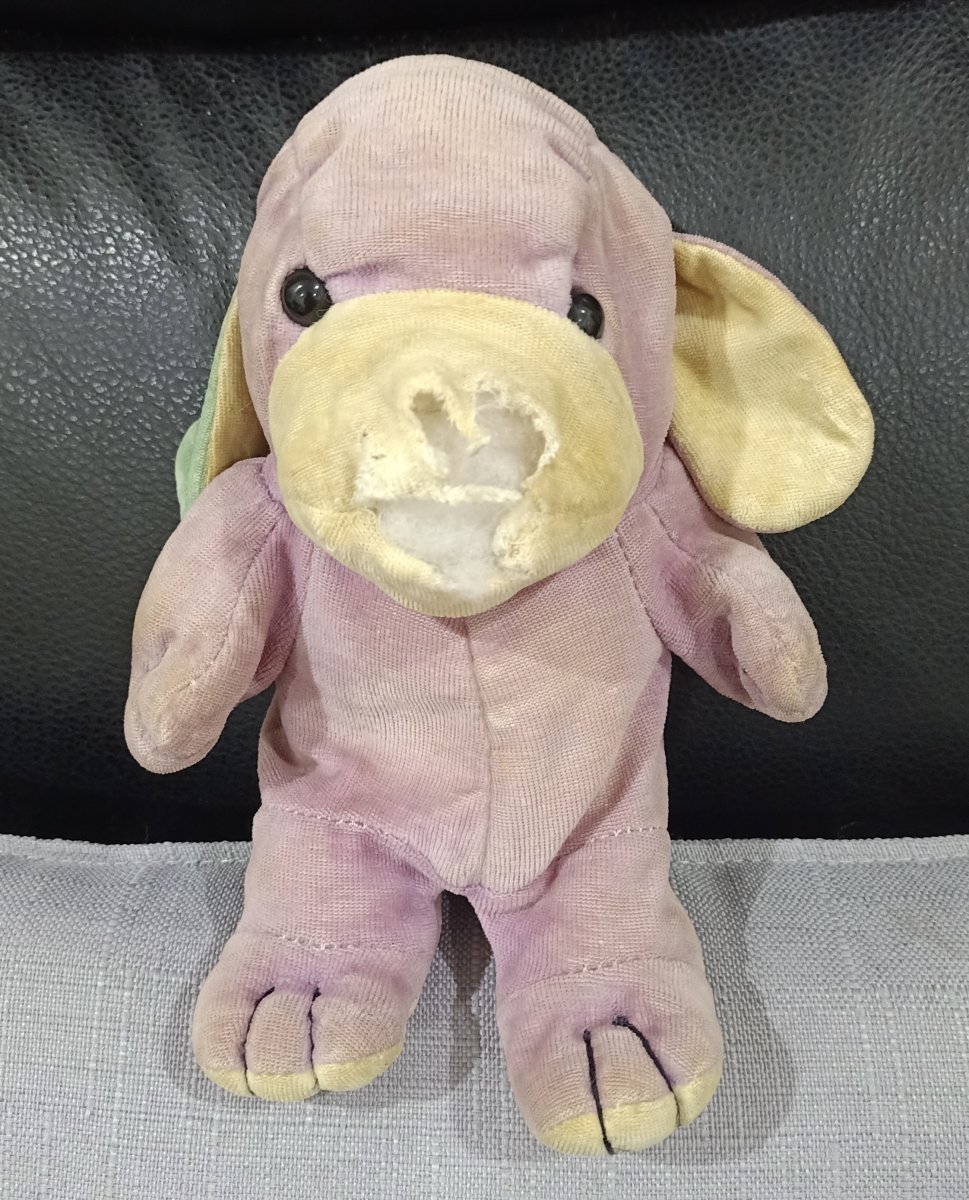 Attached are before and after photos of a black/brown dog and a pink/white dog that I repaired. Both were childhood treasures of (now) adult owners.