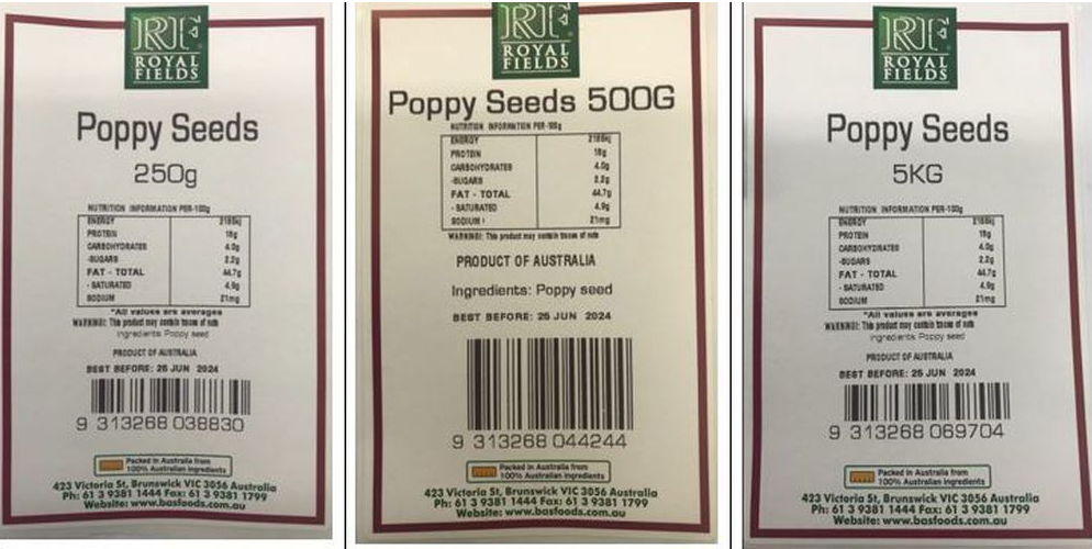The Food Standards Authority at the national level has released a product recall notice for Royal Fields Poppy Seeds in three different sizes: 250g, 500g, and 5kg. Source: Food Standards Authority AUNZ