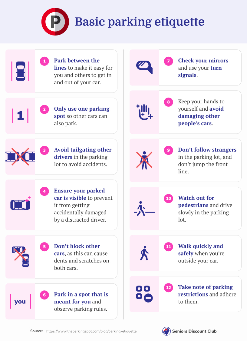 Some basic parking etiquette that we should follow for our safety. Credit: Seniors Discount Club.