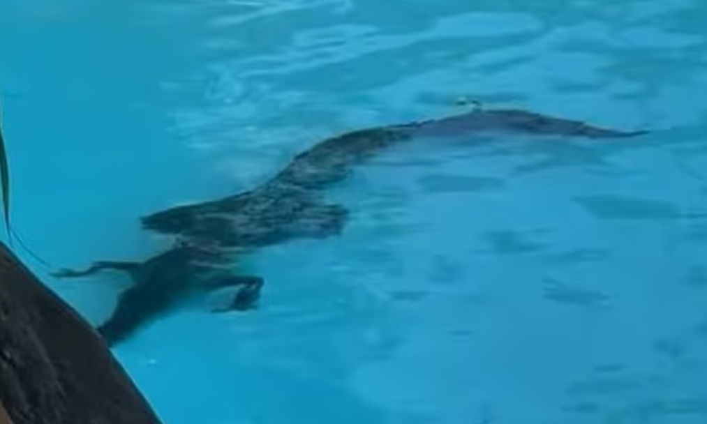 At the same time, resort staff set up barriers and guests lounged nearby, seemingly unbothered by their prehistoric poolmate.