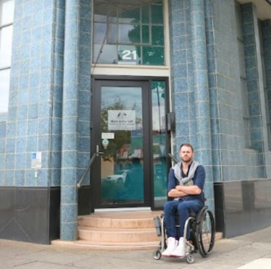 Disability advocate Shane Hryhorec poses in front of the office and the lack of wheelchair-friendly entrances. Image Credit: Shane Hryhorec