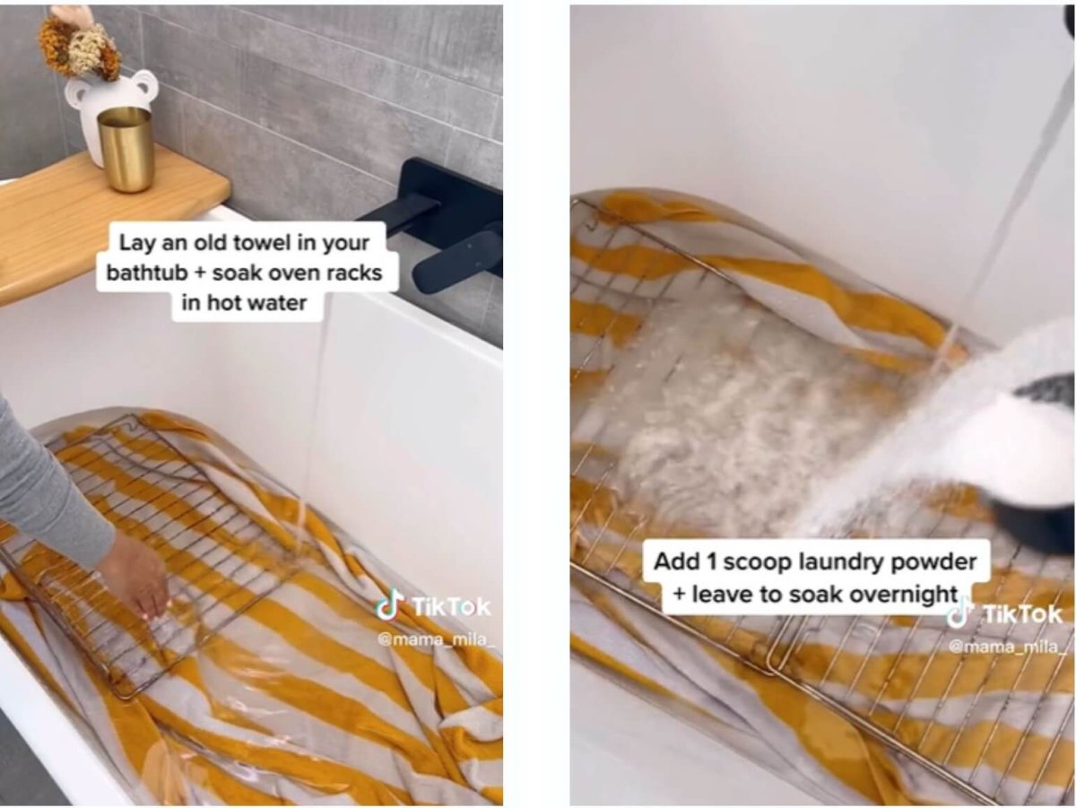 - She instructed her followers to lay an old towel down on the base of their bathtub or sink, then put the racks on top of the towel and cover them in hot water with laundry detergent.