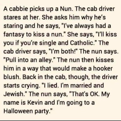 My mind was racing. What did she mean? Surely this wasn't an invitation? Before I had a chance to react in any way she continued "You can even kiss a nun twice".
