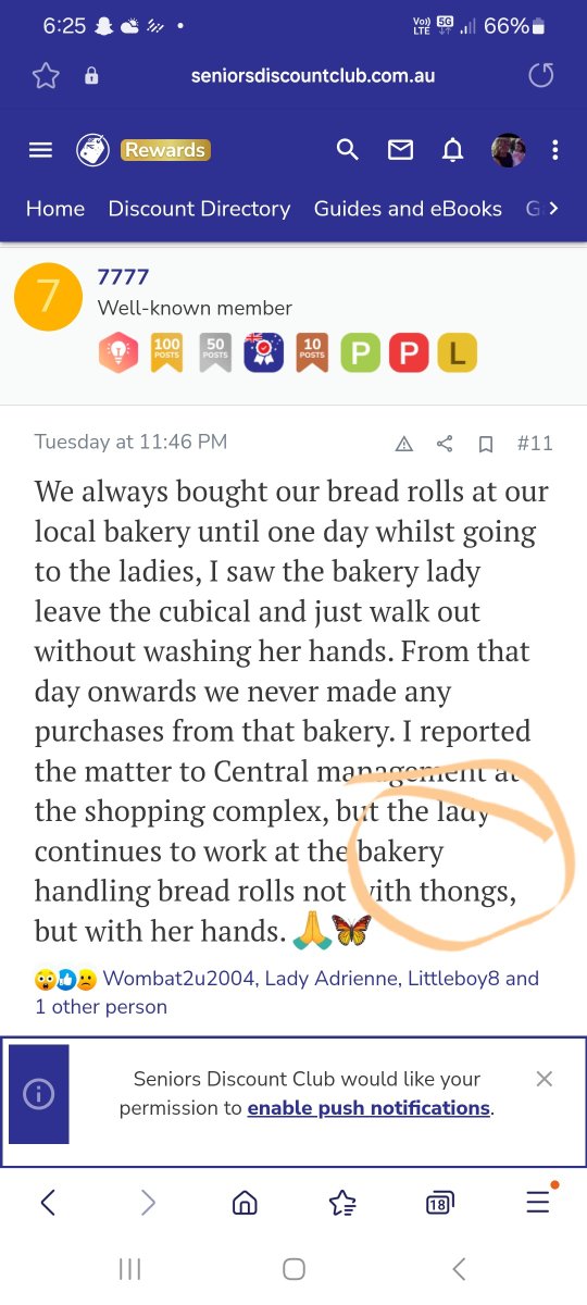 Dear member Littleboy8, she should use tongs to handle the bread rolls, because she did not wash her hands after going to the ladies toilet, as I mentioned in my post. Also, to all the bakeries that I have been to, the store attendant would always use tongs to handle bread rolls or wear thin gloves, the kind that people use when making sandwiches. Tongs or thin gloves are used when handling or preparing hands on foods, for heigine reaons. God bless, 🙏🦋
