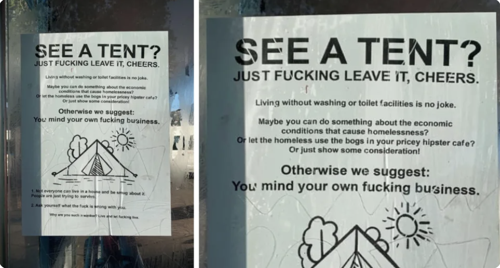 ‘Maybe you can do something about the economic conditions that cause homelessness? Or let the homeless use the bogs in your pricey hipster cafe? Or just show some consideration! Otherwise, we suggest: you mind your own f***ing business.’