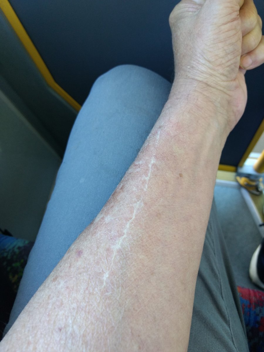 I bear these "tattoos" did I didn't ask for. I have major scars on both arms and lesser ones on my left leg and torso.