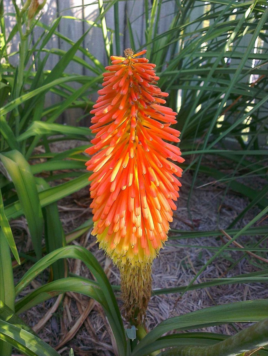 Red Hot Poker plant. When flowering, it's too top heavy for the stalk, so it bends.