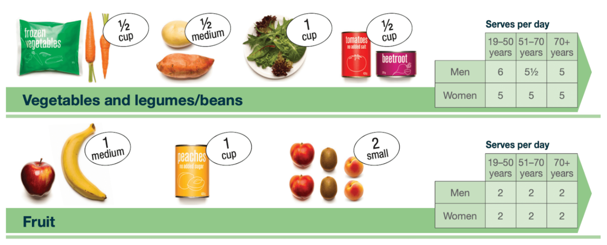 It's helpful to get to know the recommended serving sizes and serves per day so that you eat and drink the right amount of the nutritious foods you need for health. Credit: Eatforhealth.gov.au.