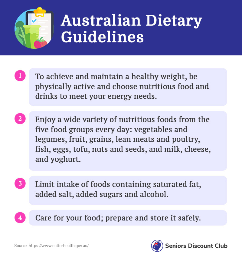 The Australian Dietary Guidelines provide advice on the types and amounts of foods, food groups, and dietary patterns that aim to promote health and well-being, reduce the risk of diet-related conditions, and prevent chronic diseases.
