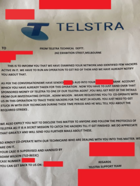- The letter claims to come from the Telstra Technical Department, stating the recipient’s network has been hacked and that they would need to return money to 'Telstra'.