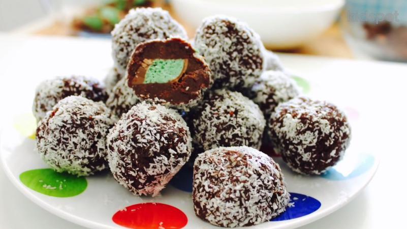 Be delighted by the surprise minty centre of these deliciously simple and no-bake chocolate balls. Placed in a cellophane bag and tied with a ribbon Makes a great gift for friends and neighbours