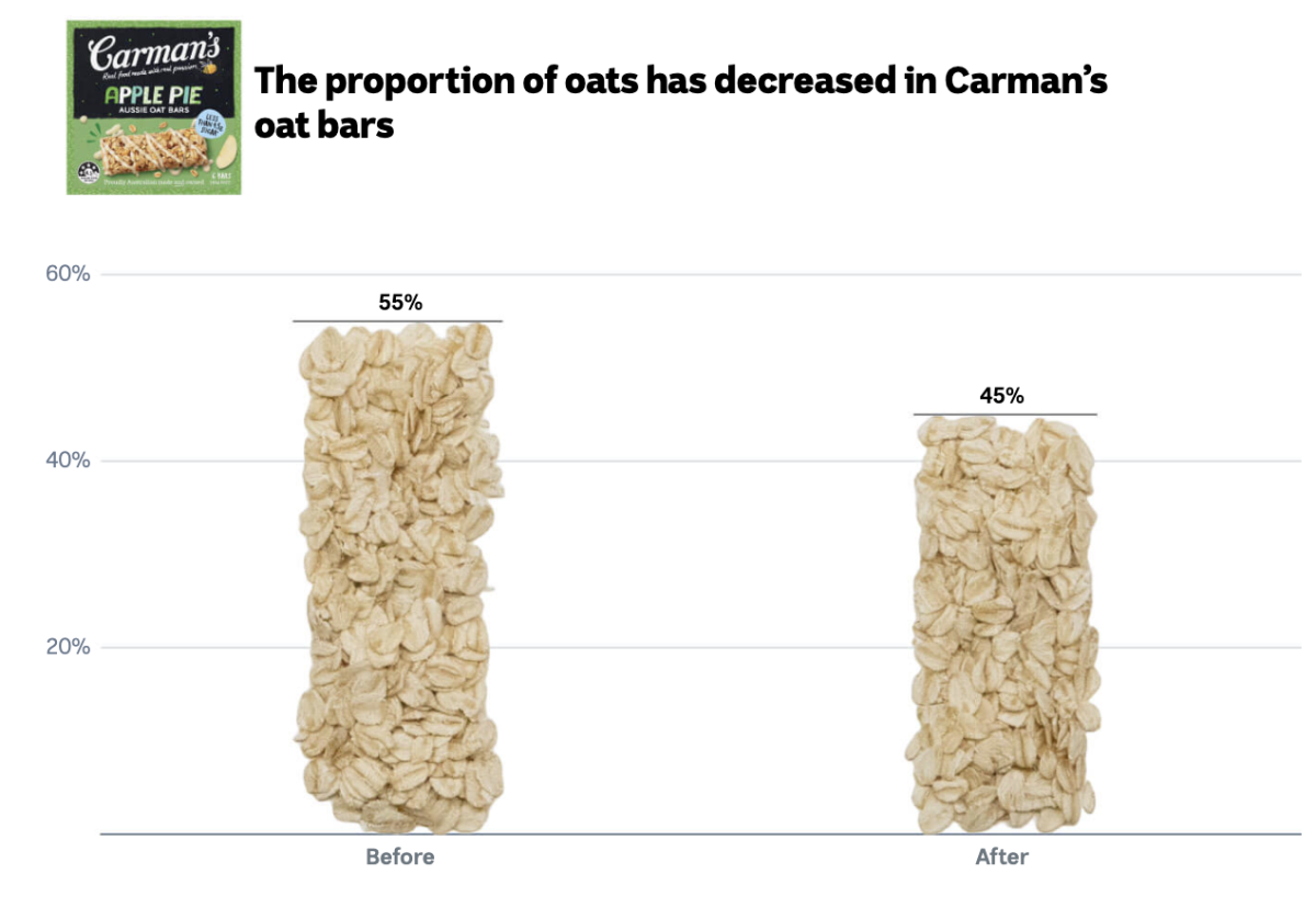 For Carman’s Apple Pie Aussie Oat Bars, the percentage of oats recently went down from 55 per cent to 45.