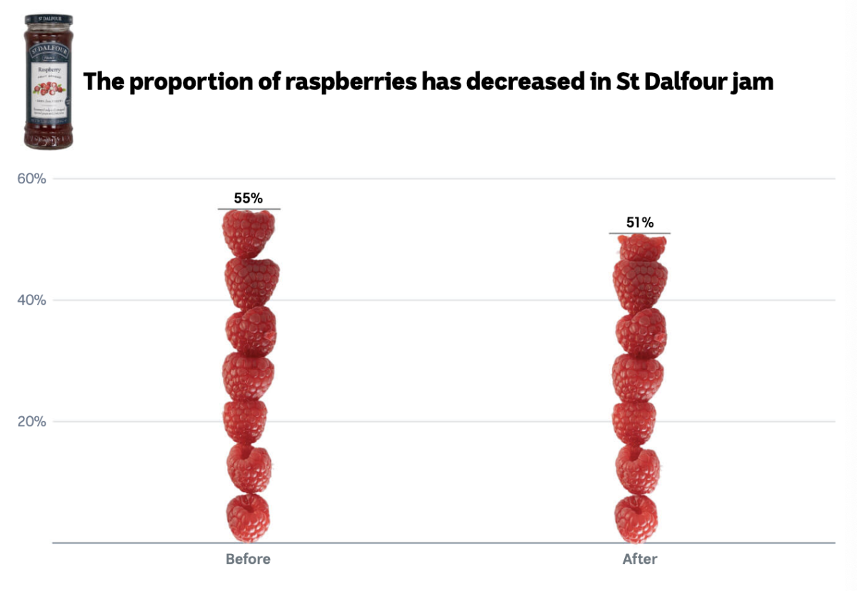 The ABC used data analysis tools to investigate about 11,000 food products listed on the Woolworths website, and looked at the percentage changes for the main or “characterising” ingredient — like raspberries in raspberry jam — across a 15-month period.
