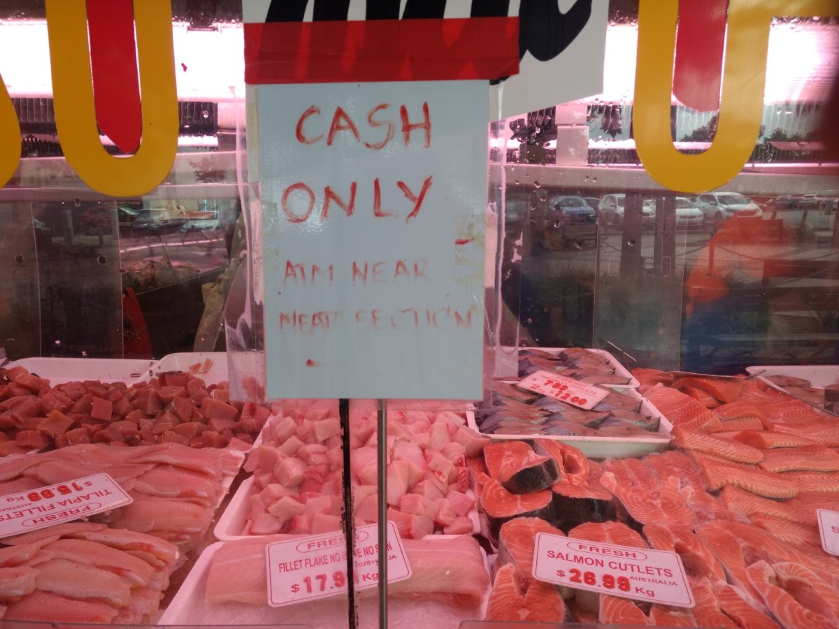 Dandenong's Palm Court yesterday. My favourite meat and seafood outlet in the area. Why? Their prices are generally $3 to $10 per kilo (depending on the cut of meat) CHEAPER than CARD ONLY outlets in the same area. And the quality is the same, if not better. Guess what! There's an ATM at the rear of the shop!
