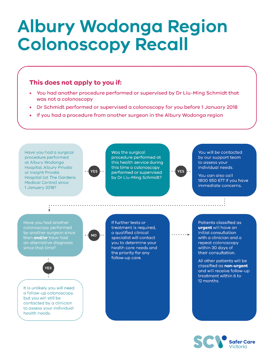 Evidence collected by an independent panel of experts found issues in some of the colonoscopies performed or supervised by the same surgeon, Dr Liu-Ming Schmidt, throughout Albury Wodonga Health, Albury Wodonga Private Hospital and Insight Private Hospital.