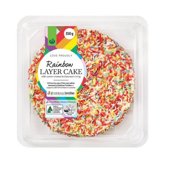 - Woolworths has launched a limited-edition Rainbow Layer Cake in time to celebrate NSW pride. Proceeds from the sale will be donated to Rainbow Families, a charity for LGBTQ+ families.