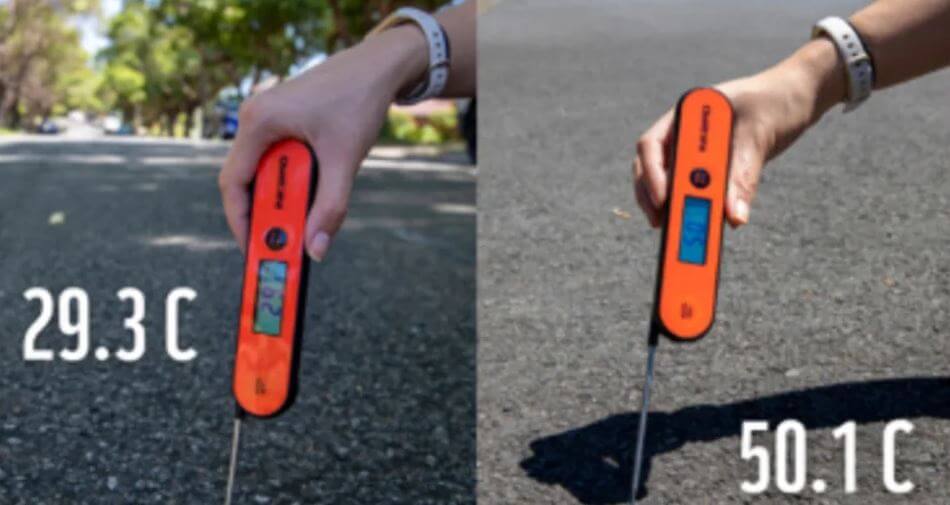 With shade provided by the overhead tree canopy, Bulli Road recorded 29.3°C in comparison to Favell Road at 50.1°C.
