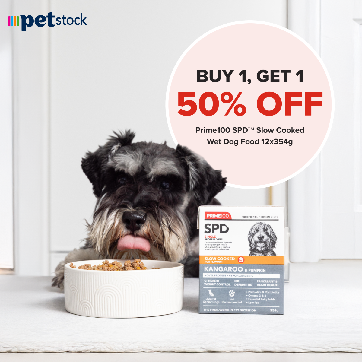 For a limited time, when you buy one, you’ll get one at 50% off on Prime100 SPD™ Slow Cooked Wet Dog Food cartons at Petstock*!