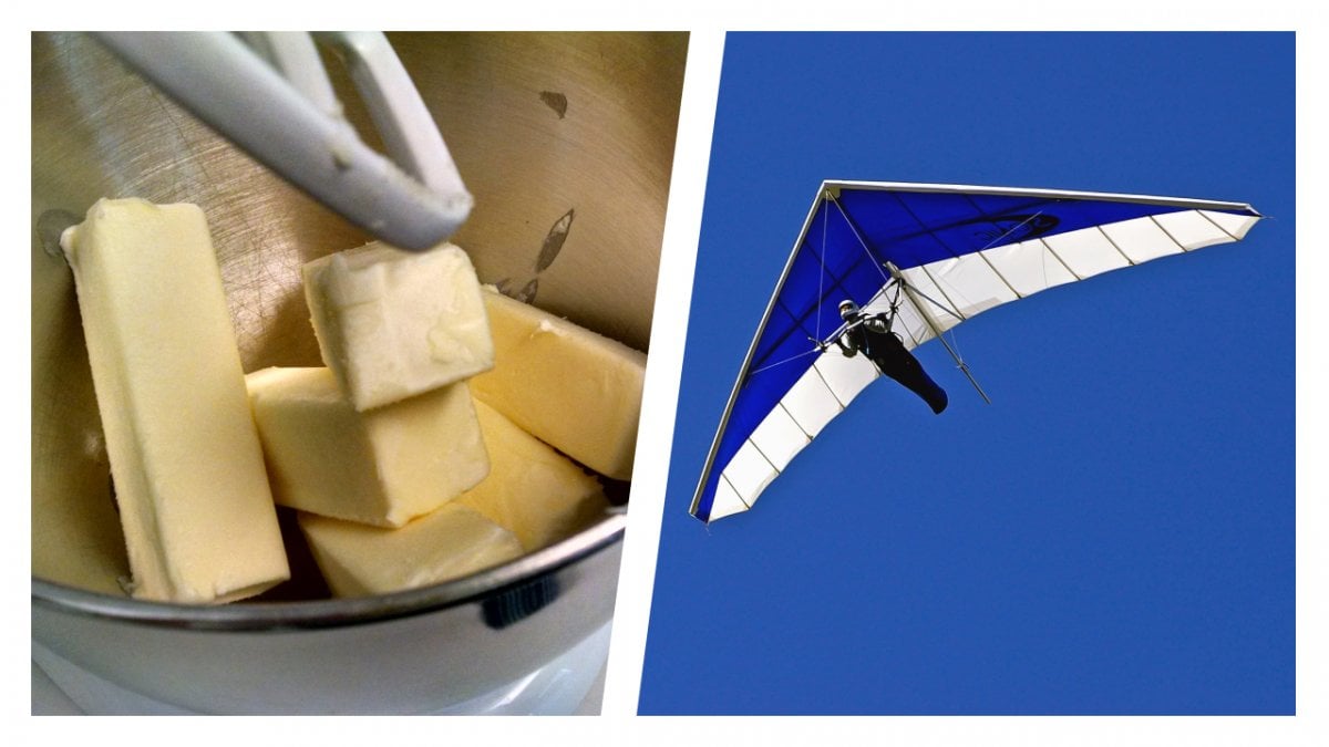 The first pic is of cubes of butter or margarine and the second picture is a person “flying” in a kite.