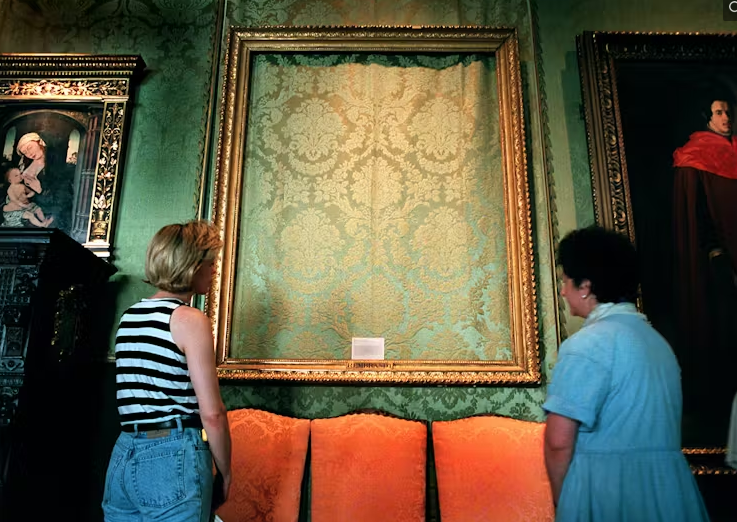 Two visitors to the Gardner Museum, Boston, observe where a Rembrandt painting used to hang, before it was stolen. John Tlumacki/The Boston Globe via Getty Images