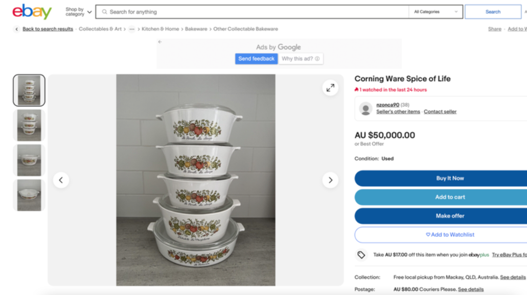 Among the $50,000 auctions, there's a used five-piece CorningWare with the popular 'Wildflowers Spice of Life' pattern, which has already attracted 36 watchers.